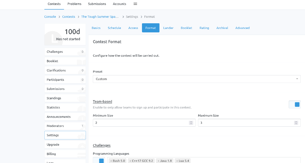 To set up a team contest, navigate to the contest’s format settings and enable “Team-based”. Specify the minimum and maximum number of members allowed in each team.