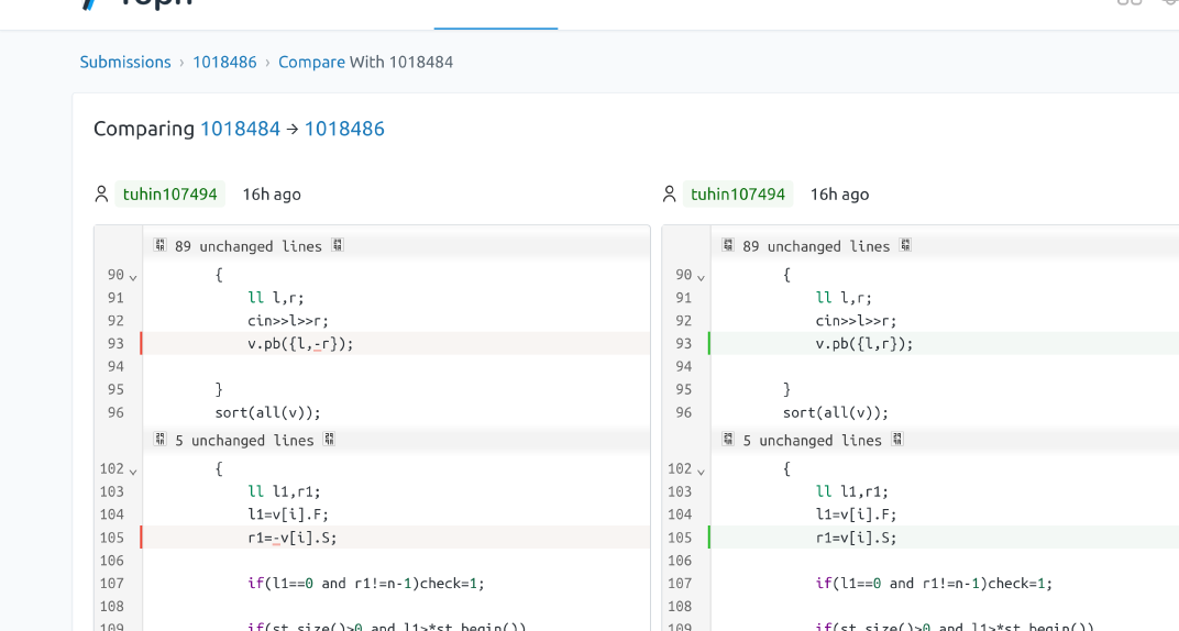 You can now compare submissions from right within Toph. No more squinting at long source codes.