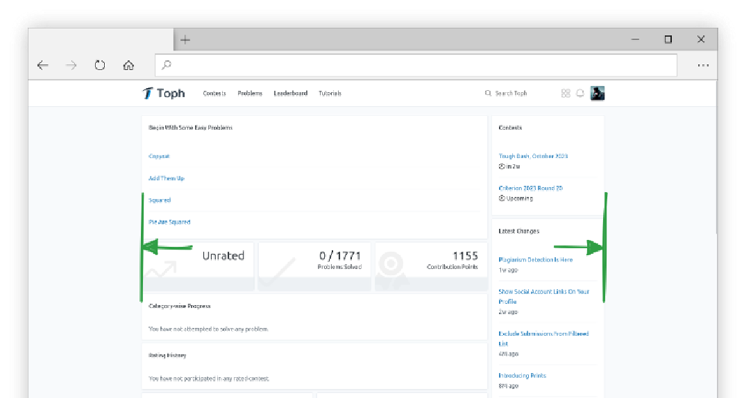 Toph uses a fixed-width layout on most pages. One of the few exceptions is the arena where the layout is full-width.