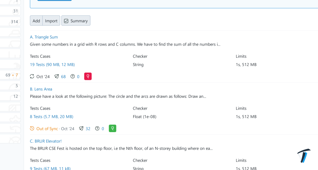 A new summary view lets moderators see limits, checker/driver type, and test suite statistics directly in the challenge list.
